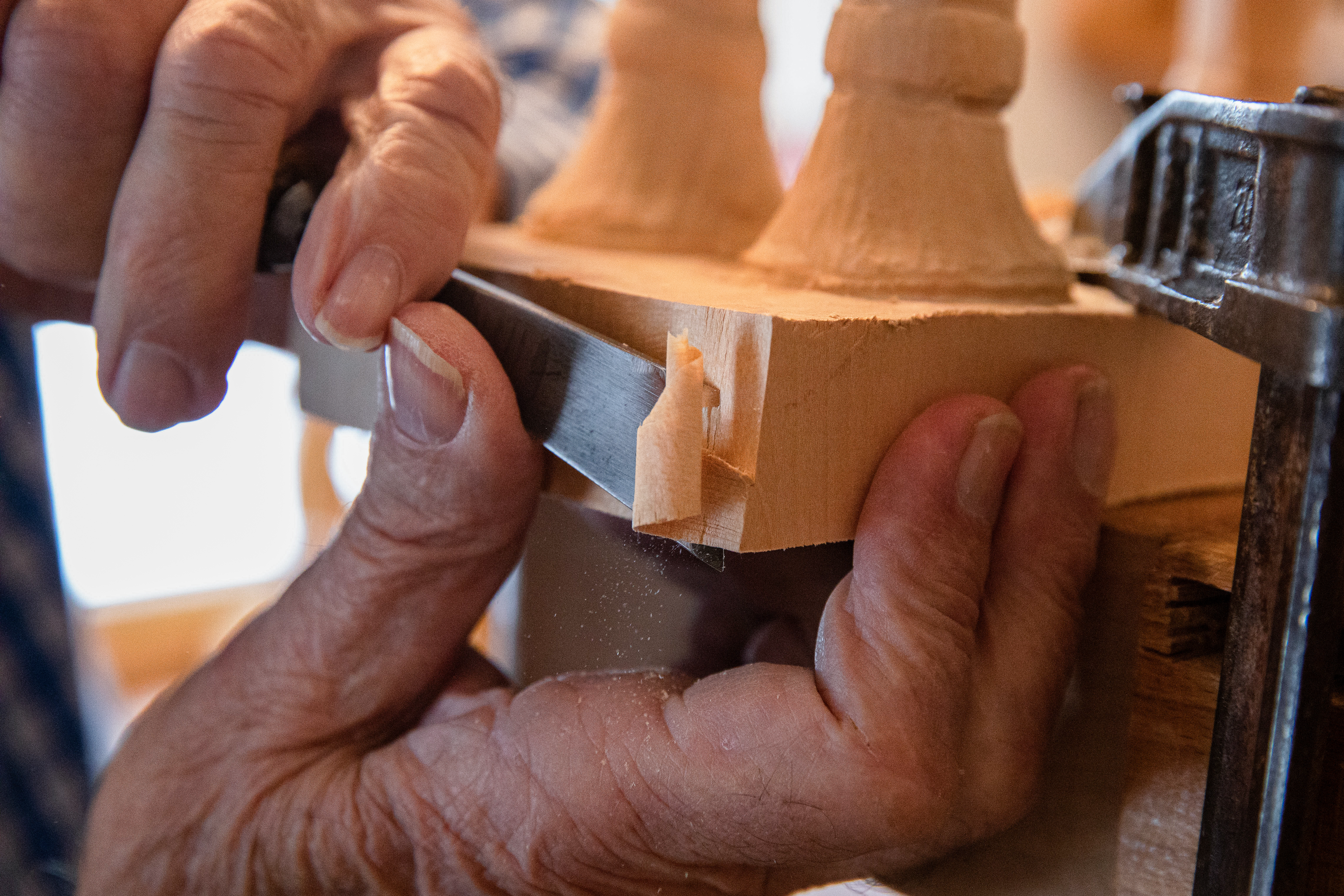 Sebastian Demmel, a German woodworker, chisels strips of wood off a Trojan horse sculpture at his workshop in Bad Tölz, Germany, Dec. 1, 2023. Demmel is an Honorary Green Beret and Honorary Original of the 10th Special Forces Group (Airborne). (U.S. Army photo by Sgt.