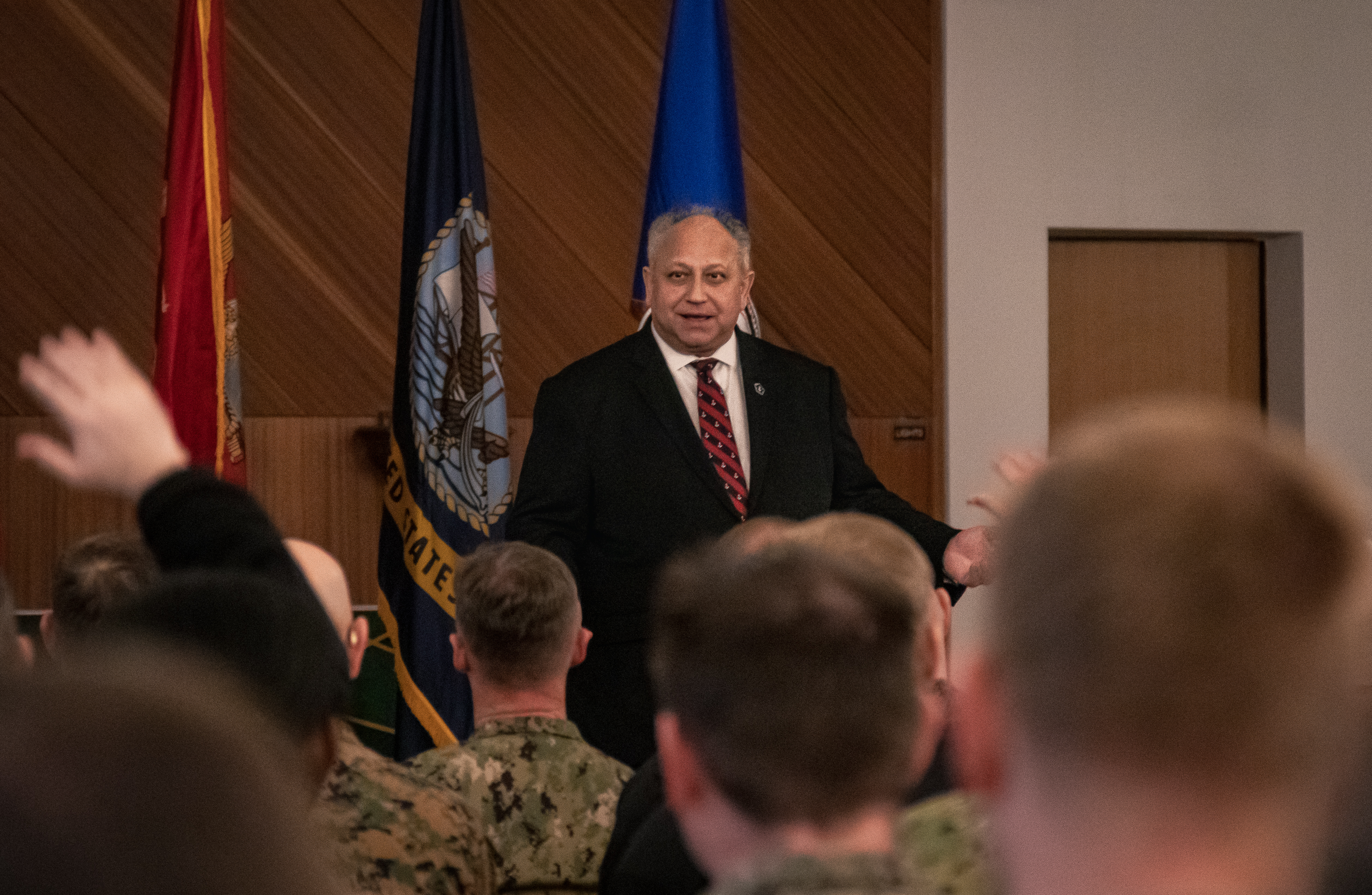 U.S. Secretary of the Navy Carlos Del Toro leads an all-hands event at Patch Barracks during a visit to the U.S. European Command headquarters in Stuttgart, Germany, on Jan. 22, 2024. In addition to meeting with U.S. Navy and personnel supporting USEUCOM, Del Toro met with U.S. European Command leadership to discuss support to NATO and strengthening security relationships in Europe.