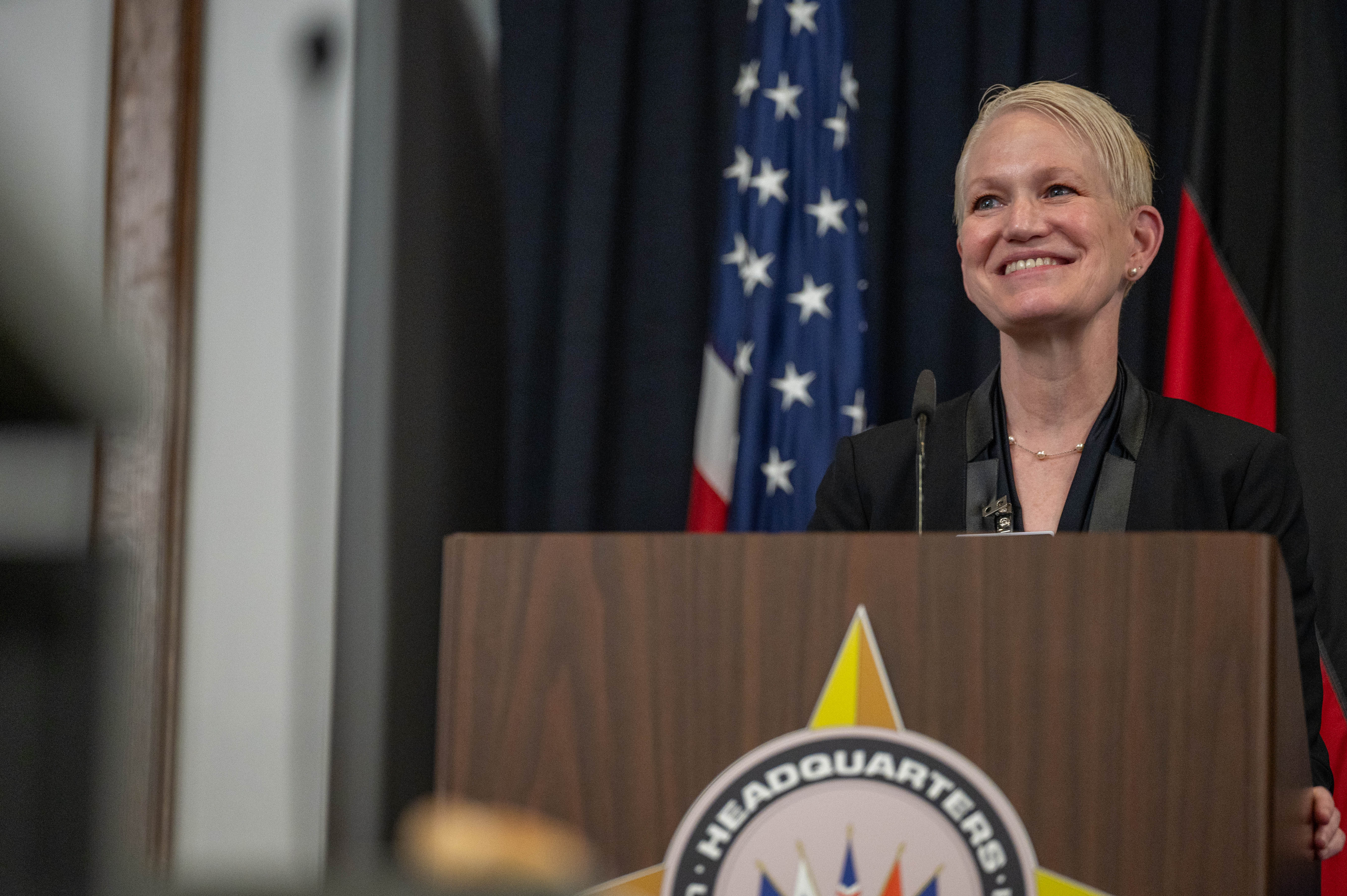 U.S. Assistant Secretary of Defense for International Security Affairs Celeste Wallander provides remarks during the European Strategy Conference and Workshop at Ramstein Air Base, Germany, on Feb. 1, 2024. Nearly 750 military and civilian leaders from more than 30 Allied and partner nations took part in the event to discuss the impacts of malign influence in the Euro-Atlantic, and considerations to implement and execute NATOS's regional plans to enhance European security and stability.