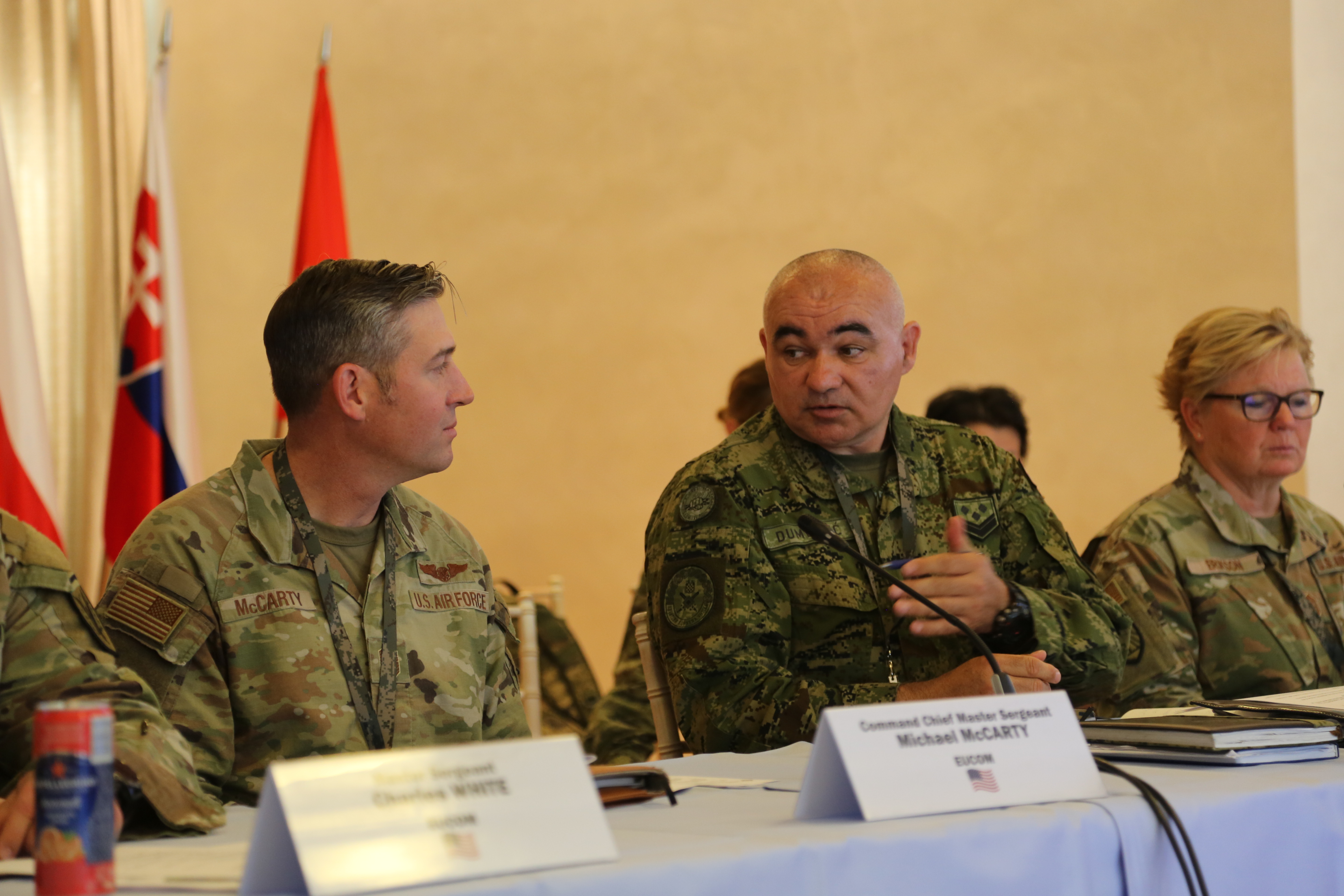 Chief Master Sergeant Michael McCarty, representing U.S. European Command' Senior Enlisted Leader Command Sgt. Maj. Rob Abernathy, and Croatian Command Sgt. Maj. Dalibor Dumbović, sergeant major of the Croatian Army, co-host a meeting of senior enlisted leaders as part of the 2024 Central Europe Chiefs of Defense conference in Split, Croatia, June 10. The meeting provided an opportunity for senior enlisted leaders form Central Europe nations and their U.S. National Guard counterparts to strengthen military ties, address ongoing security challenges, enhance mutual understanding, and improve interoperability and joint training development.