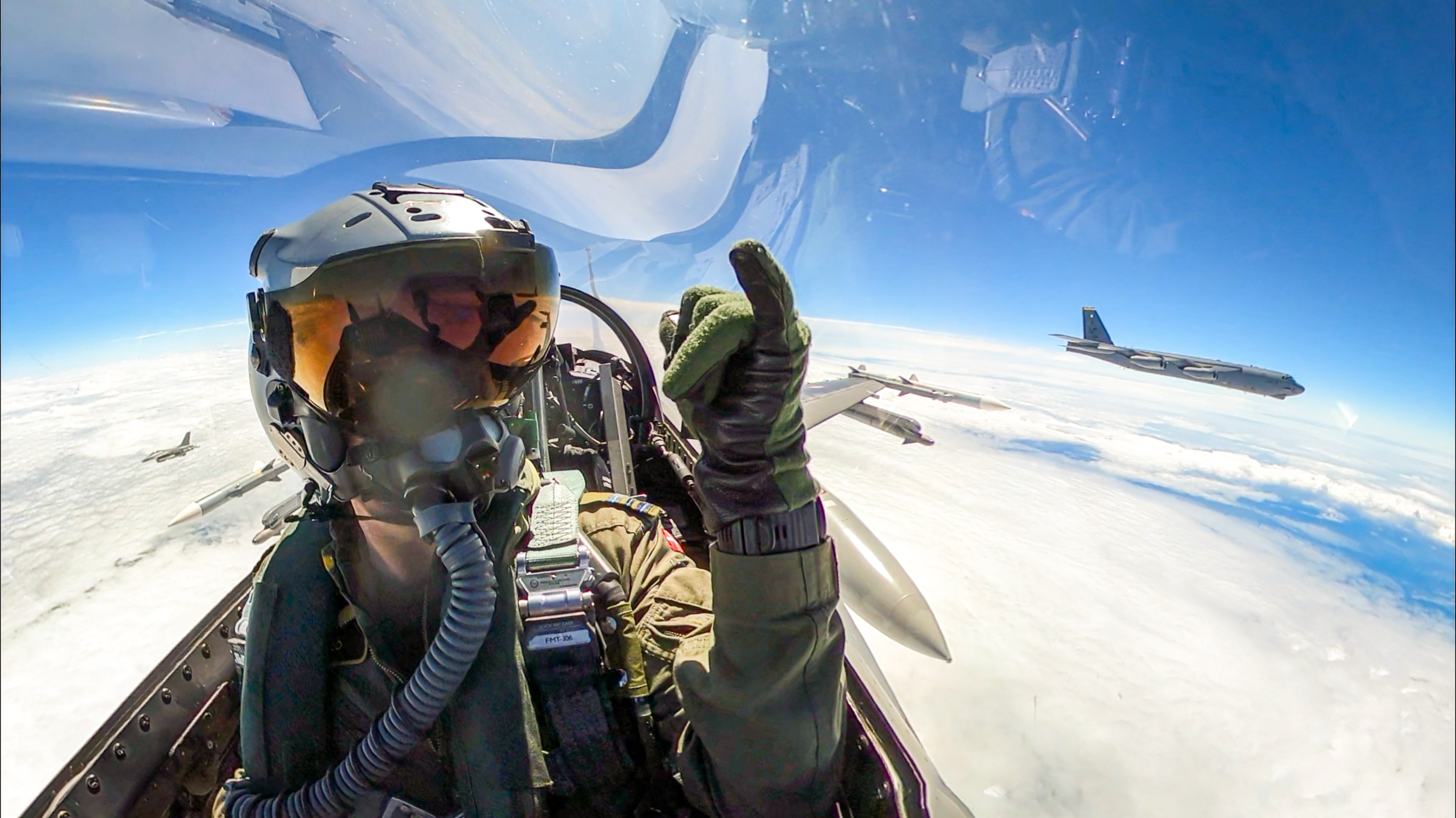 A Danish fighter pilot flies alongside a U.S. Air Force B-52 Stratofortress as part of exercise Global Guardian's Bomber Task Force Europe 24-3 deployment, June 20, 2024.